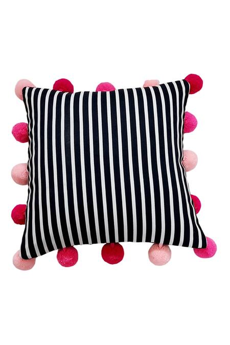 White, black cushion cover with stripe pattern all over & pink pom pom border.