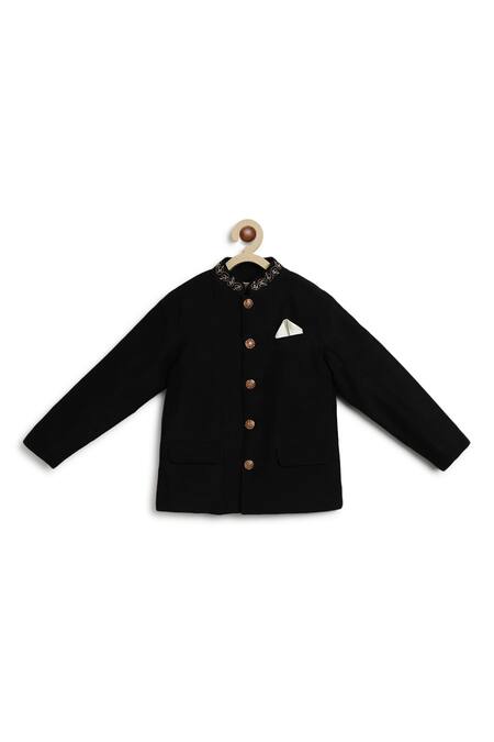 Black bandhgala jacket featuring full sleeves and fleur zari embroidery on the band collar