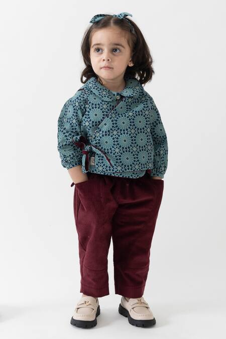Blue and maroon reversible jacket featuring geometric print, paired with a printed shirt and balloon pant. The shirt has a Peter pan collar and front button closure, while the pant includes convenient pockets.