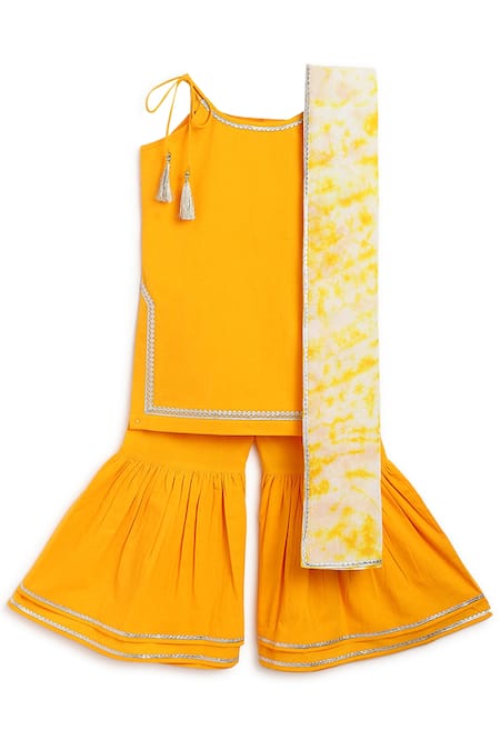 Yellow kurta featuring gota embroidered motifs on the border. Paired with a tiered sharara and a dye dupatta with back button detailing.