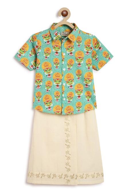 Kathakali print on shirt, Elasticated waist for comfort, Embroidered detailing on mundu dhoti