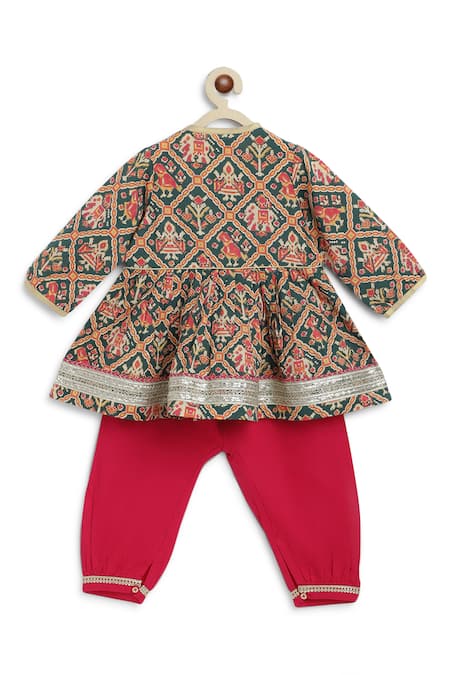 Green cotton peplum kurta featuring floral checkered bandhani print with contrast lace border. Paired with pleated salwar featuring lace border and elasticated waistband.