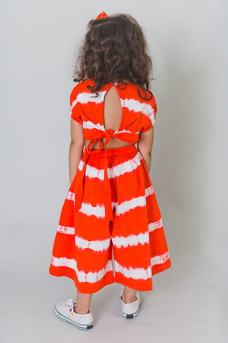 Orange tie-dye crop top featuring a round neckline and tie-up bow back. Paired with flared culottes showcasing a striped pattern and semi-elastic waistband.