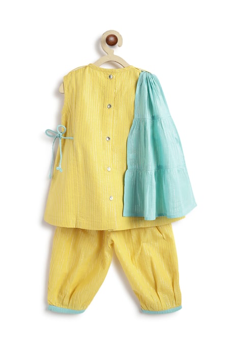 Yellow kurta featuring silver stripes and tie-up details. Paired with a matching salwar in cotton lurex fabric.