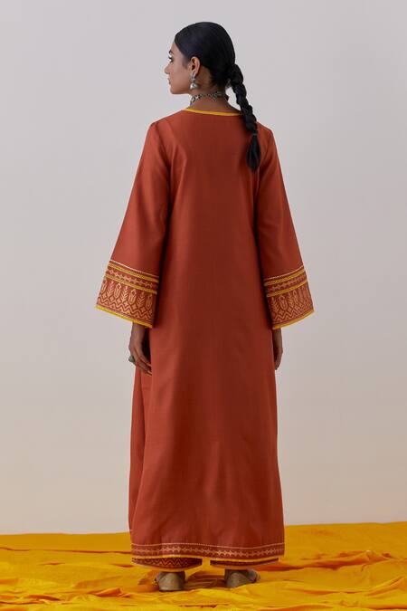 Orange kurta featuring gota lace embellishments, a round neckline, and flared sleeves. Paired with matching palazzo pants.