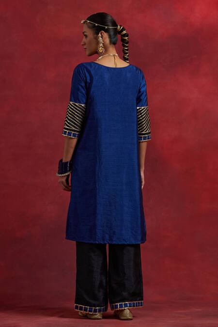 Blue raw silk straight kurta featuring gota embroidered cuffs. Paired with a black palazzo and a matching dupatta.