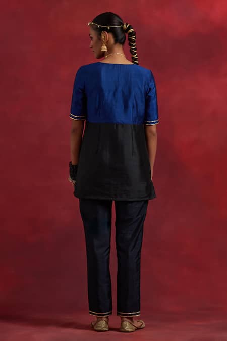 Blue Silk Gota Patti V-neck Sadhna Colour Block Kurta Pant Set