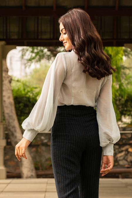 Ice blue chiffon plain shirt with pleated flowy sleeves.