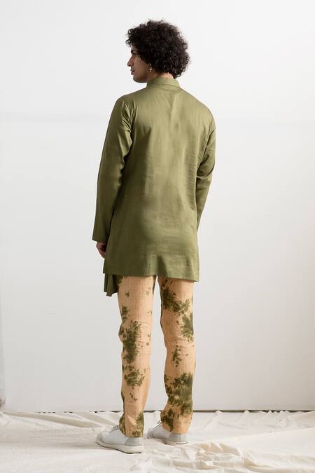 Beige-green bundi with all-over tie-dye pattern, band collar, stylized placket & sleeveless. Comes with green kurta & linen pant.