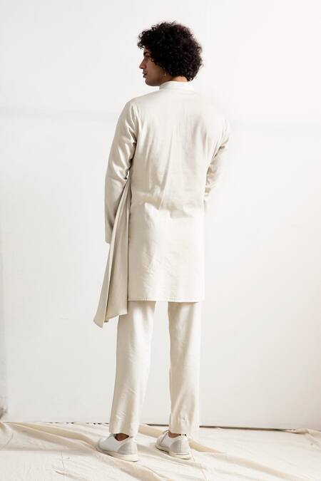 Light grey bundi with all-over tie-dye pattern, band collar, stylized placket & patch pocket. Comes with white asymmetric kurta & pant.