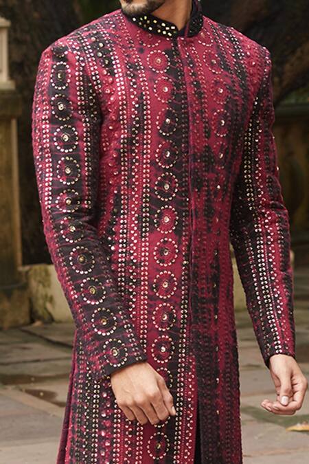 Wine, black tie & dye sherwani with hand embroidered French knots & mirror work. Paired with silk kurta & churidar.