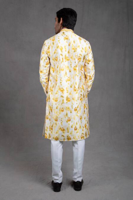 Marigold kurta with tie & dye printed motifs, thread & mirror embroidered work. Paired with white dupion silk churidar.