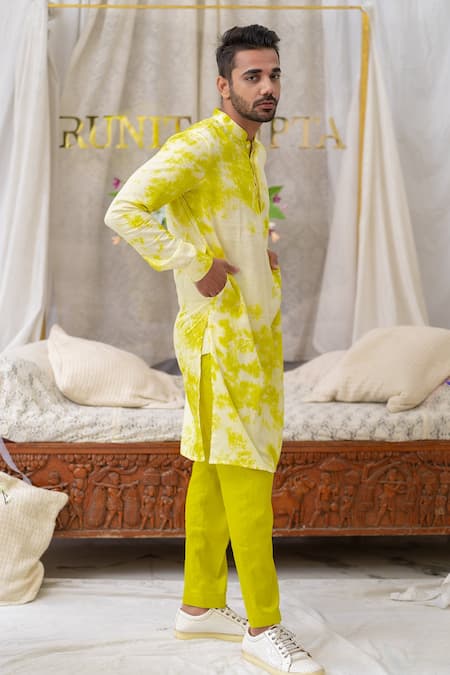 Green hand dyed kurta with mandarin collar & cuff sleeves. Paired with pyjama pant.
