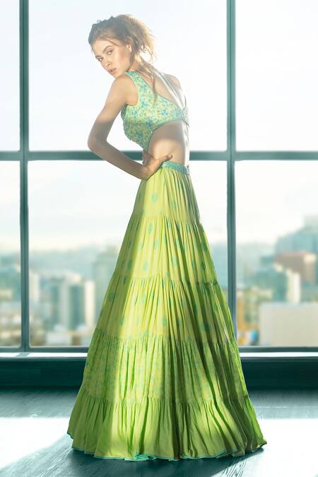 Mint green 5-tiered anarkali-gown with all-over print, cutout waist & contrast tone floral motif embroidery. Comes with net dupatta enhanced with chitta work.