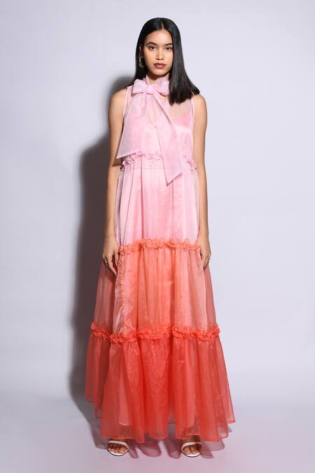 Coral and pink organza lined gown with tier details & high neck. Comes with inner slip.
