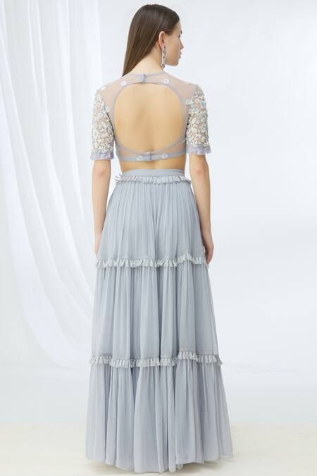 Grey blouse with cutdana & sequin embellishments. Comes with tiered lehenga & ruffle dupatta.