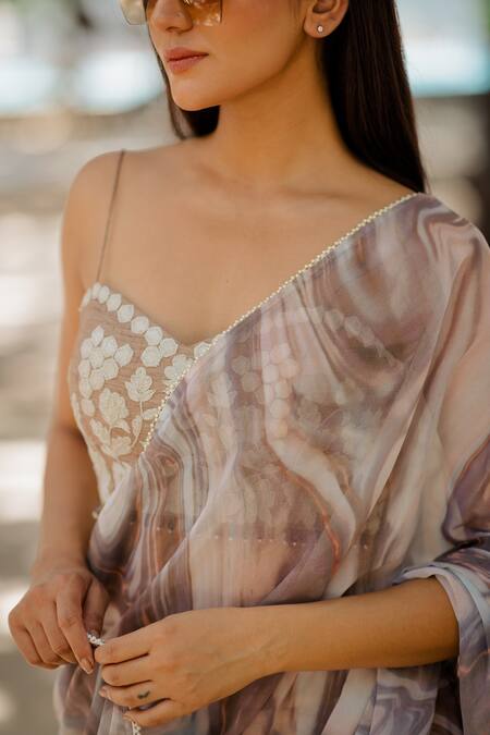 Brown tiered saree with marble effect. Paired with floral embroidered blouse.