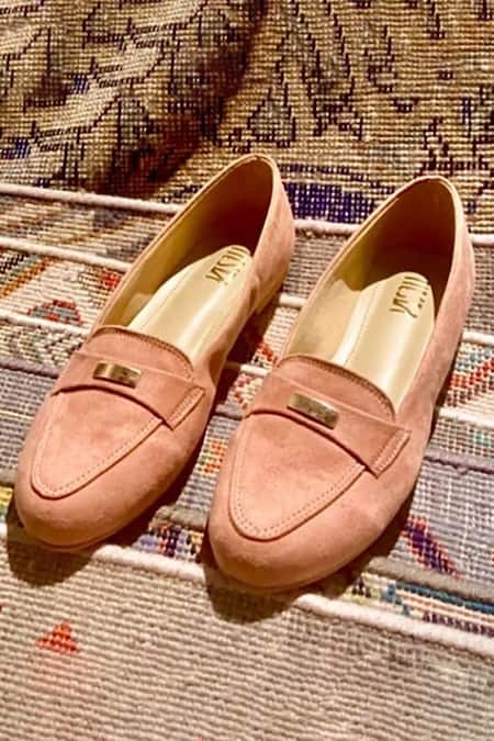 Pink suede flats featuring stitch line detailing and a metal buckle