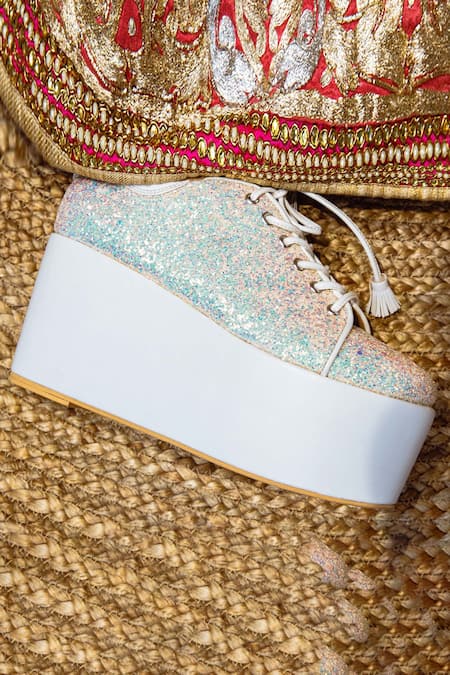 Silver Glitter, Sequins Begum Embellished Sneaker Wedges