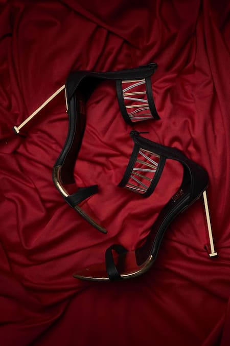 Intricate ankle strap with gold and silver lines, Rectangular thin metal heel, Cushioned insole for comfort