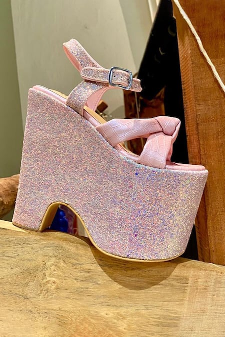 Pink shimmer wedges featuring a textured pattern and front knot detailing