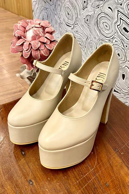 Beige faux leather block heels featuring a closed toe design and a buckle ankle strap