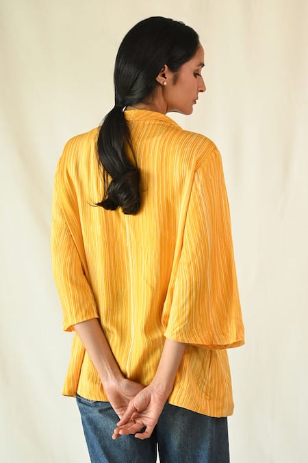 Yellow Cotton Satin Collared Amber Stripe Hand Painted Jacket