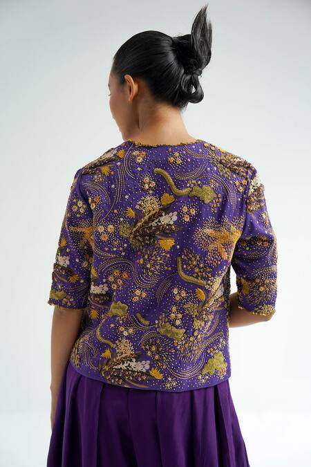 Purple jacket featuring abstract print with intricate thread work embroidery