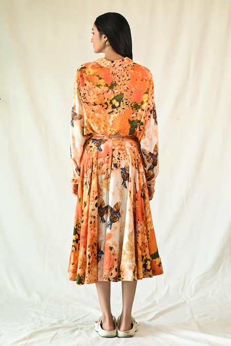 Til_Orange Cotton Satin Embroidery Arbor Digital Printed Shirt And Draped Skirt Set _Online_at_Aza_Fashions