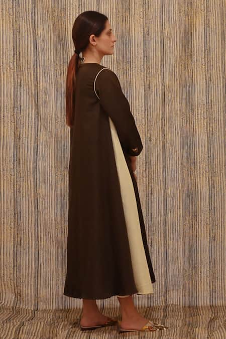 Brown Cotton Silk Satin Round Colorblock A-line Dress