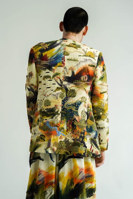 Multi Color Cotton Embroidery Dreamscape Brush Stroke Print Overlay Jacket