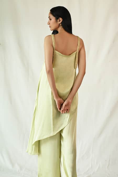 Buy_Til_Green Cotton Satin Beads Square Neck Luna Asymmetric Tunic And Pant Set_at_Aza_Fashions