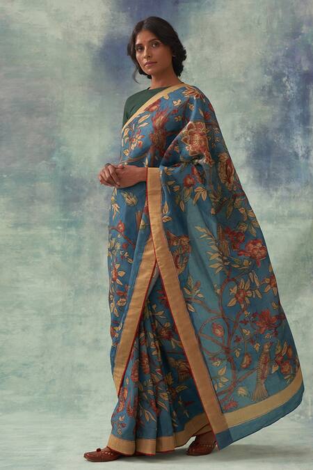 Blue Pure Banarasi Silk Floral Tilak Kalamkari Kanjivaram Saree