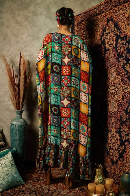 Tile prints throughout the cape, Front open design, Relaxed fit