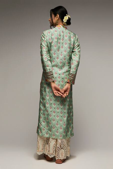 Buy_Gopi Vaid_Blue Tussar Gota Patti, Embroidery V-neck Tilla Floral Print Kurta_at_Aza_Fashions