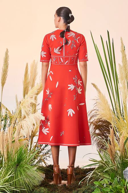 Red Double Crepe Branch Pattern Round Tiny Corset Midi Dress