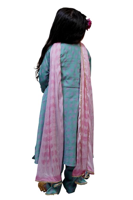 Blue angarkha kurta featuring block printed motifs and lace trim. Paired with matching pants and a tie and dye dupatta with gold lace border.