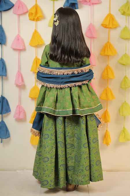 Green Chanderi, Cotton, Chiffon Fringe Block Print Kurta Sharara Set
