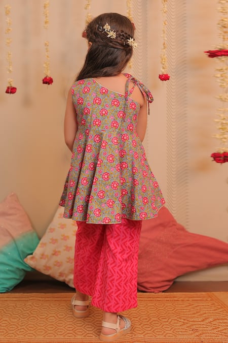 Green peplum kurta featuring pink floral block print with one side tie-up shoulder. Paired with printed pants in a matching design.
