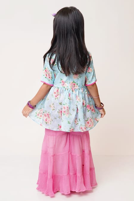 Blue kurta featuring a floral pattern and V neckline. Paired with a tiered pink sharara with a back zipper closure.