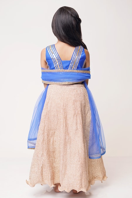 Gold shimmer lehenga featuring kalis and side tie-up. Paired with a gota patti embroidered blue blouse and sheer dupatta with lace trim.