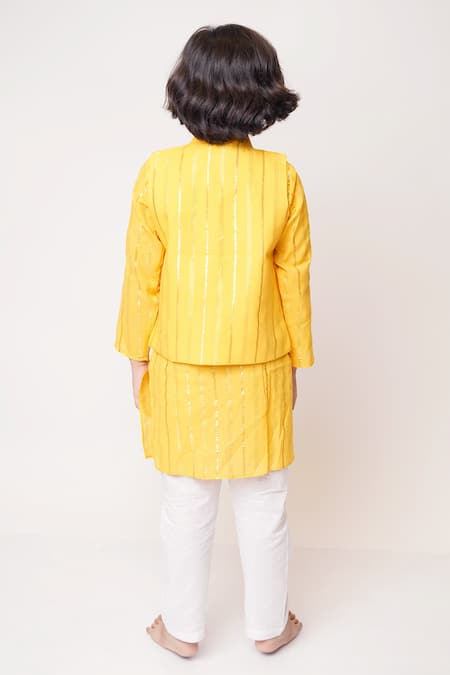 Yellow Cotton Stripe Pattern Bundi And Kurta Set