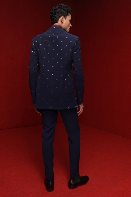 Navy blue bandhgala featuring cutdana embroidery in an abstract pattern. Paired with a coordinating kurta and pant.