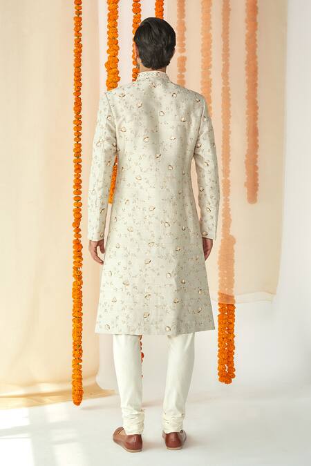 Light grey sherwani with floral embroidery. Comes with pants.