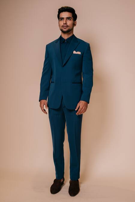 Teal blue tuxedo with lapel collared neckline. Paired with tonal shirt & trousers.
