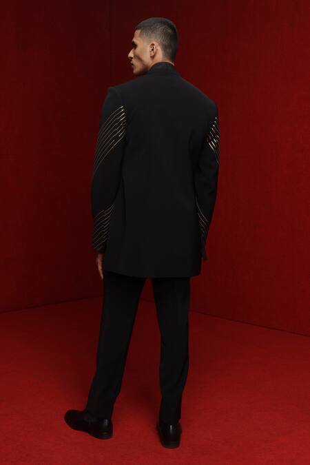 Black sherwani featuring sequin embellished full sleeves and a mandarin collar. Paired with a matching inner kurta and pant.