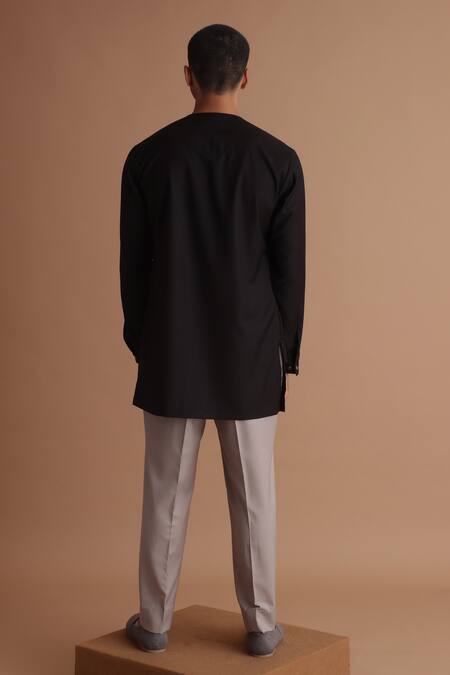 Black kurta featuring a Mandarin collar and full sleeves with ruffle detailing at the front. Paired with tonal elasticated pants for a coordinated look.
