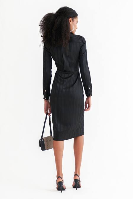 Black dress constructed in self-stripe satin finish fabric along with edgy attached belt detailing.