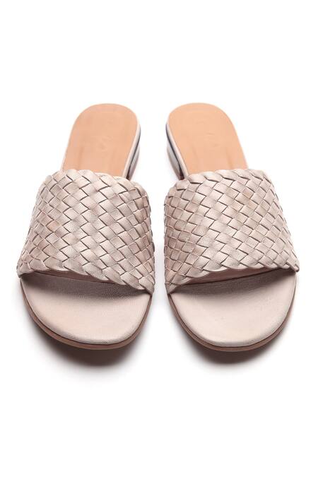 Beige slip-on sandals featuring a basketweave textured strap