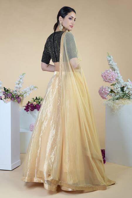 Gold sheen lehenga with 6 kali detail & side pockets. Comes with black embroidered blouse & dupatta.